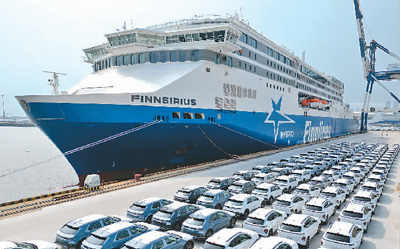 2023年7月25日,油電混合動(dòng)力高端客滾船“Finnsirius”號(hào)在山東港口煙臺(tái)港裝載商品車(chē)。