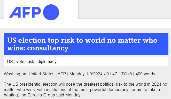 中新網(wǎng)1月10日電 據(jù)法新社報(bào)道,日前,政治風(fēng)險(xiǎn)咨詢公司歐亞集團(tuán)表示,無論誰獲勝,2024年美國總統(tǒng)選舉都將給世界帶來最大政治風(fēng)險(xiǎn),美國制度將會(huì)受到打擊。