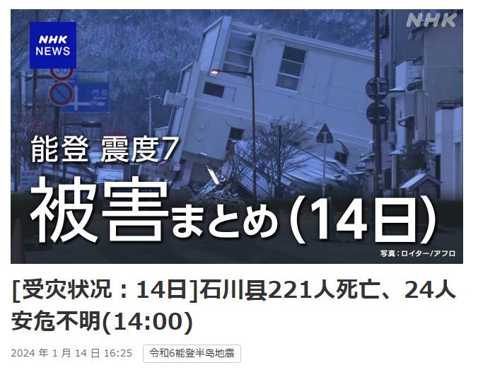 中新網(wǎng)1月14日電 據(jù)日本廣播協(xié)會(NHK)報道,日本石川縣最新統(tǒng)計數(shù)據(jù)顯示,截至當(dāng)?shù)貢r間14日下午2時,日本石川縣能登地區(qū)1日發(fā)生的7.6級地震已造成221人遇難。