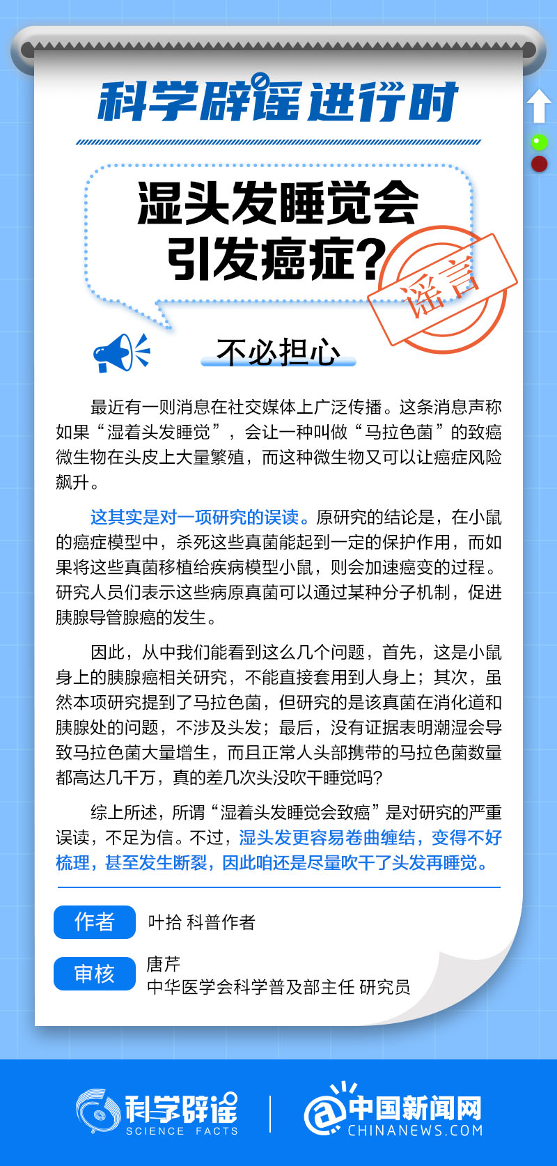 中新網(wǎng)1月15日電 最近有消息稱,如果濕著頭發(fā)睡覺,會(huì)讓一種叫做“馬拉色菌”的致癌微生物在頭皮上大量繁殖,而這種微生物又可以讓癌癥風(fēng)險(xiǎn)飆升。但事實(shí)上,這是對(duì)一項(xiàng)研究的誤讀。不過,濕頭發(fā)更容易卷曲纏結(jié),變得不好梳理,甚至發(fā)生斷裂,大家最好還是盡量吹干了頭發(fā)再睡覺。詳情↓(來源:@科學(xué)辟謠 中國新聞網(wǎng)微博 )