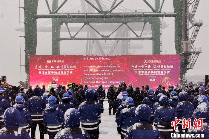 1月17日,天津車?yán)遄涌炀€首發(fā)儀式在天津港太平洋國際集裝箱碼頭舉行?!败?yán)遄涌炀€”始發(fā)于智利圣安東尼奧港,直抵天津港。未來一周,還將有2艘次智利車?yán)遄迂洿诌_(dá)天津港,累計(jì)8300噸車?yán)遄蛹捌渌厦乐蕻a(chǎn)品從天津港上岸。 中新社記者 佟郁 攝