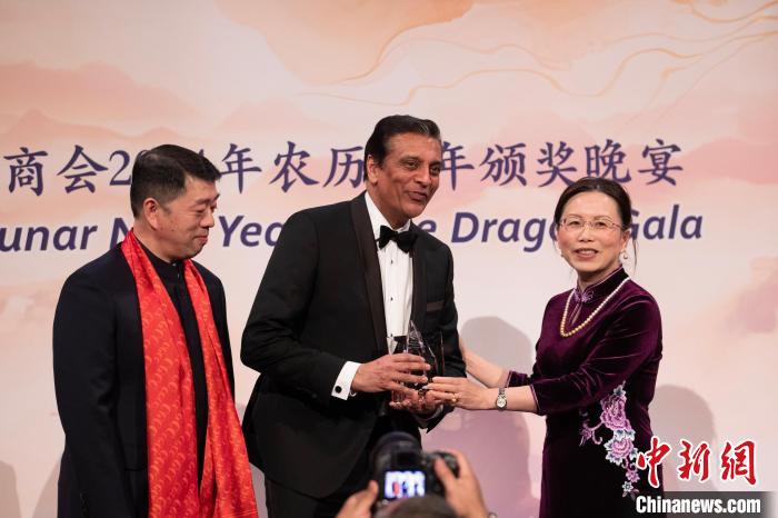 當(dāng)?shù)貢r(shí)間1月18日,美國中國總商會(huì)(CGCC)在紐約舉行2024年農(nóng)歷龍年頒獎(jiǎng)晚宴。圖為中國駐美國大使館公使徐學(xué)淵(右)為聯(lián)邦快遞總裁兼首席執(zhí)行官拉杰·蘇巴馬廉(中)頒發(fā)“國際領(lǐng)導(dǎo)力獎(jiǎng)”?!≈行律缬浾?廖攀 攝