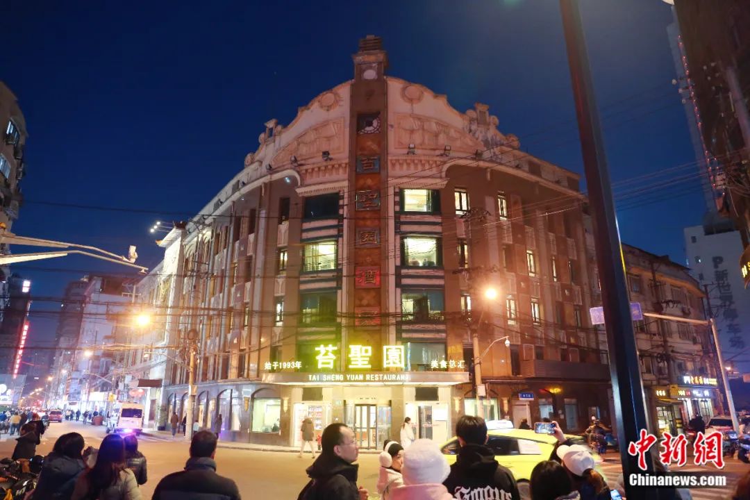 2024年1月4日,黃河路美食街上的苔圣園酒家(電視劇《繁花》中的至真園原型)吸引眾多市民游客打卡拍照。陳玉宇 攝