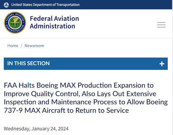 中新網(wǎng)1月25日電 當?shù)貢r間1月24日,美國交通部發(fā)布公告稱,美國聯(lián)邦航空管理局(FAA)批準了必須對每架停飛的波音737 MAX9型飛機執(zhí)行徹底的檢查和維護程序,檢查維護完成后這些飛機才有資格恢復運營。