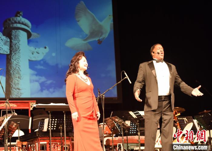 當(dāng)?shù)貢r(shí)間1月27日晚,以紀(jì)念中美建交45周年為主題的鷹飛龍騰新年音樂會在美國洛杉磯唱響。圖為中美兩國歌唱家聯(lián)袂演唱《我愛你中國》?!≈行律缬浾?張朔 攝