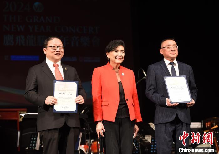 當(dāng)?shù)貢r(shí)間1月27日晚,以紀(jì)念中美建交45周年為主題的鷹飛龍騰新年音樂會在美國洛杉磯唱響。圖為美國聯(lián)邦眾議員趙美心(中)向美國鷹龍傳媒董事長蘇彥韜(左)等主辦方代表頒發(fā)賀狀?!≈行律缬浾?張朔 攝