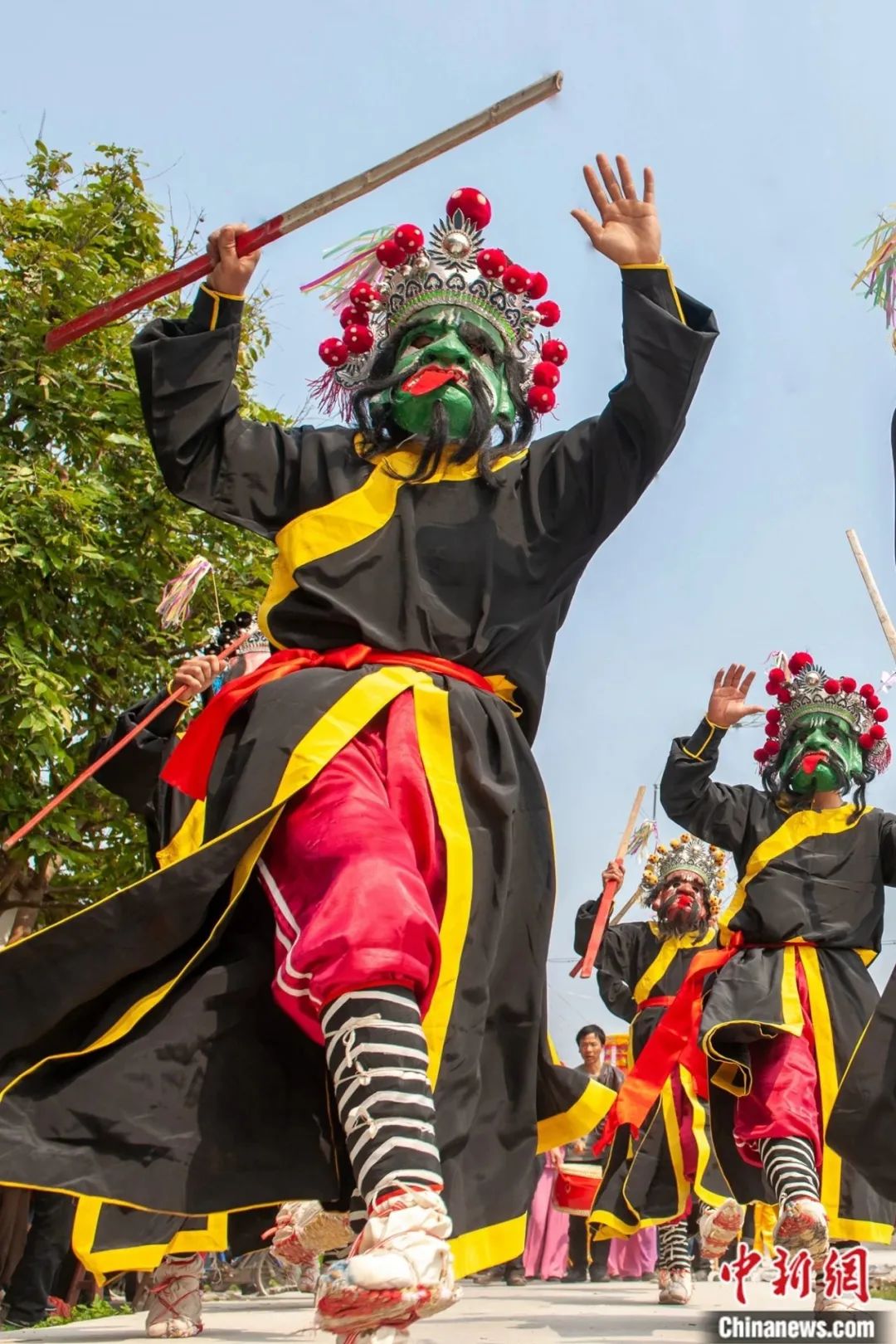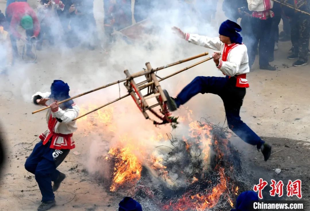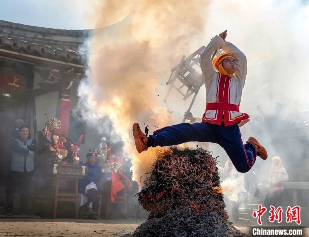 “僮身”表演者在莆禧古城“上刀梯”祈福。中新社記者 王東明 攝