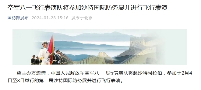 中新網(wǎng)1月28日電 據(jù)國防部官方微信消息,應(yīng)主辦方邀請,中國人民解放軍空軍八一飛行表演隊將赴沙特阿拉伯,參加于2月4日至8日舉行的第二屆沙特國際防務(wù)展并進行飛行表演。
