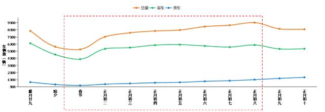 預(yù)計春節(jié)期間全國高速公路客車日均流量約4890萬輛,小客車占客車比例預(yù)計達99%以上。貨車流量在春節(jié)節(jié)前逐日下降,在正月初一達到最低值,春節(jié)假期之后逐漸恢復到日常水平,但貨車流量同比去年預(yù)計有所增長。