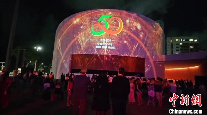 2月3日晚間,累西腓燈光秀匯演活動中展示了中巴建交50周年的紀(jì)念標(biāo)志。曹璇攝
