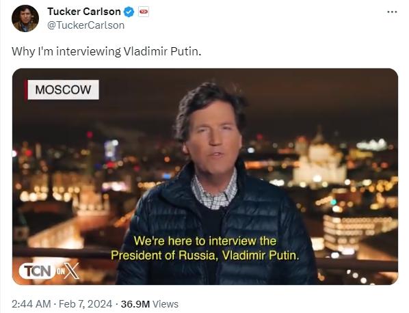 據(jù)介紹,卡爾森是??怂闺娨暸_(tái)的一名當(dāng)紅主播,主要負(fù)責(zé)一檔名為《卡爾森今夜秀》的新聞節(jié)目。他在2023年4月被福克斯解雇,隨后在社交平臺(tái)X上繼續(xù)發(fā)布采訪(fǎng)節(jié)目。路透社稱(chēng),卡爾森2023年8月在X上發(fā)布的對(duì)美國(guó)前總統(tǒng)特朗普的采訪(fǎng)獲得了上億播放量。