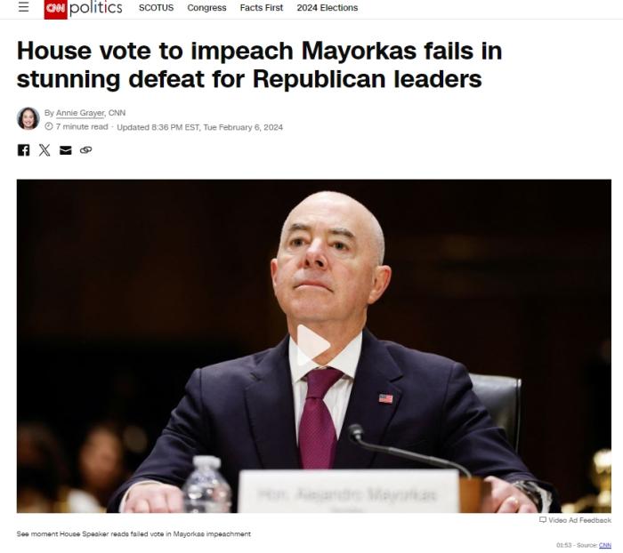 據(jù)此前報(bào)道,美國(guó)眾議院共和黨人1月28日宣布了針對(duì)馬約卡斯的兩項(xiàng)彈劾條款,指控他“蓄意且系統(tǒng)性地拒絕遵守法律”,且違背公眾信任。馬約卡斯則對(duì)此否認(rèn),并為自己的工作辯護(hù)。