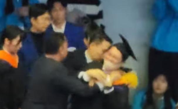 據在場人員透露,在尹錫悅致辭時,一名身穿學士服的男生面向尹錫悅所站立的講臺高喊。之后,總統(tǒng)警衛(wèi)人員捂住他的嘴巴,并把他強行抬出會場。