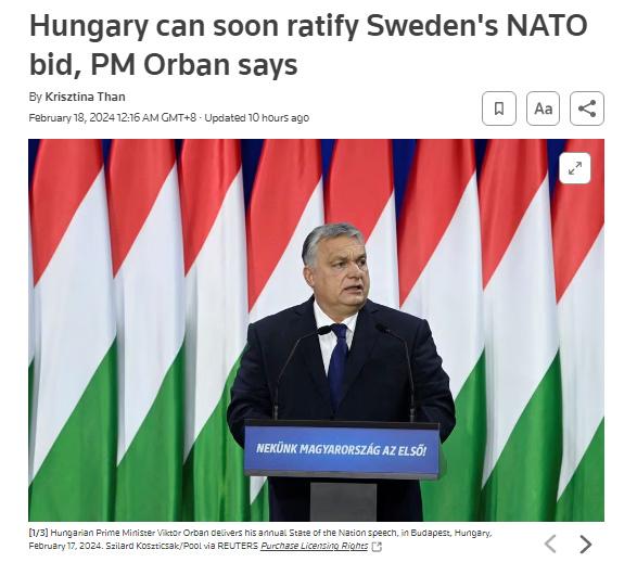 中新網(wǎng)2月18日電 據(jù)路透社報道,當(dāng)?shù)貢r間17日,匈牙利總理歐爾班·維克托在一次演講中表示,匈牙利議會可能在2月晚些時候召開的春季會議上,批準(zhǔn)瑞典加入北約。