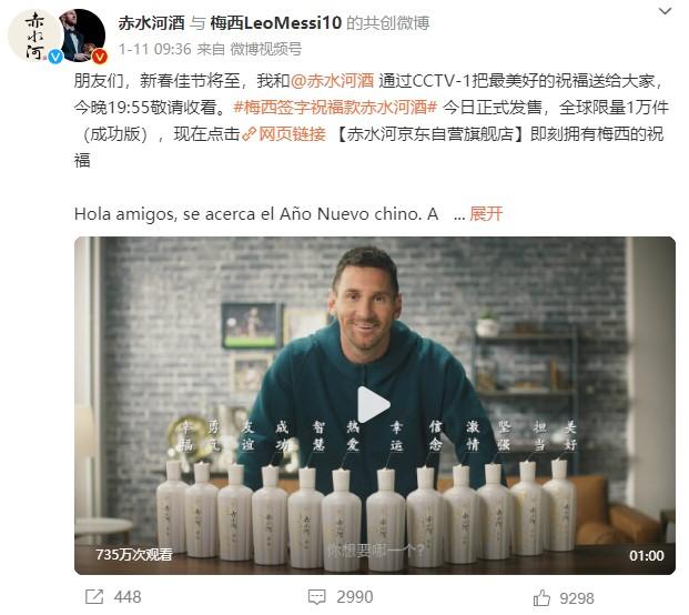 1月11日,梅西發(fā)博官宣牽手赤水河酒。梅西個人微博發(fā)文稱,梅西簽字祝??畛嗨泳飘斎照桨l(fā)售,全球限量1萬件,并配上了一段梅西為酒瓶一一簽名的宣傳視頻。