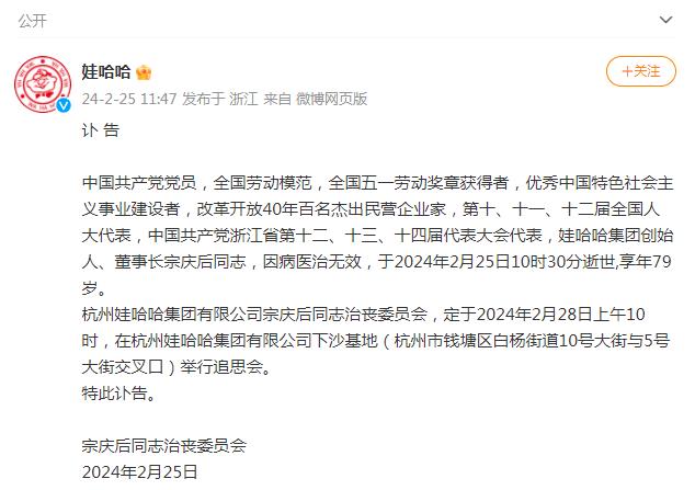 中新網(wǎng)2月25日電 據(jù)娃哈哈集團(tuán)官方微博消息,娃哈哈集團(tuán)創(chuàng)始人、董事長(zhǎng)宗慶后因病醫(yī)治無效,于2024年2月25日10時(shí)30分逝世,享年79歲。