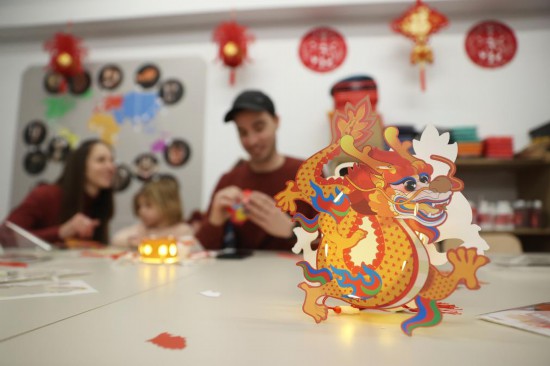 2月24日,人們在比利時班什舉行的“金龍迎新——2024比利時生肖設計展”期間體驗制作龍形燈籠。(新華社記者趙丁喆攝)