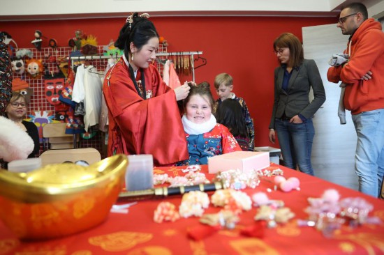 2月24日,小朋友在比利時班什舉行的“金龍迎新——2024比利時生肖設計展”期間體驗漢服妝造。(新華社記者趙丁喆攝)
