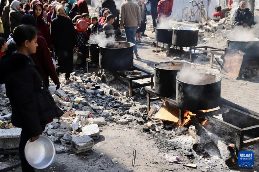 2月27日,在加沙地帶北部的杰巴利耶難民營(yíng),人們等待領(lǐng)取食物。新華社發(fā)(穆罕默德·阿里攝)