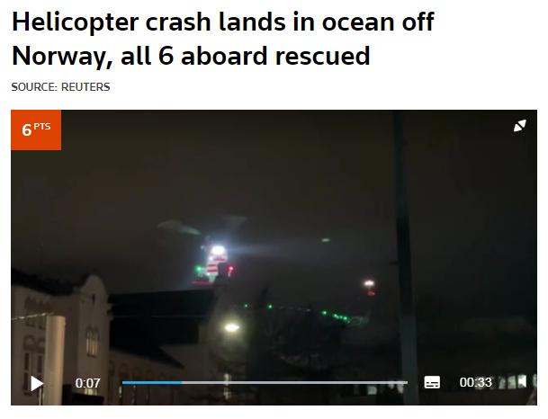 中新網(wǎng)2月29日電 據(jù)路透社報道,當?shù)貢r間28日,挪威聯(lián)合救援協(xié)調(diào)中心稱,一架載有6人的直升機在挪威西部海岸附近海域墜毀,機上所有人員隨后被從海中救起。