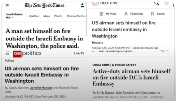 正常一則報(bào)道,標(biāo)題最好是能以最高效的方式聚合“時(shí)間地點(diǎn)人物起因經(jīng)過結(jié)果”諸要素(因?yàn)槭恰靶侣劇?,時(shí)間要素反而可以選擇弱化),而在西方主流媒體對(duì)這次自焚抗議事件的第一批報(bào)道中,標(biāo)題基本都只有“地點(diǎn)人物結(jié)果”三個(gè)要素,即《某人在以色列使館自焚》這樣的表達(dá),最多會(huì)加一個(gè)“空軍”或“現(xiàn)役空軍”的人物身份。