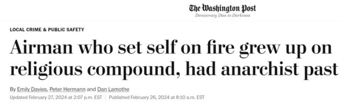 標(biāo)題為《自焚的空軍在宗教場(chǎng)所長大,有無政府主義的過往》。顯然,這樣的標(biāo)題在強(qiáng)烈暗示布什內(nèi)爾的行為可能受到極端宗教和極左思想的影響。