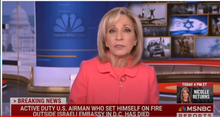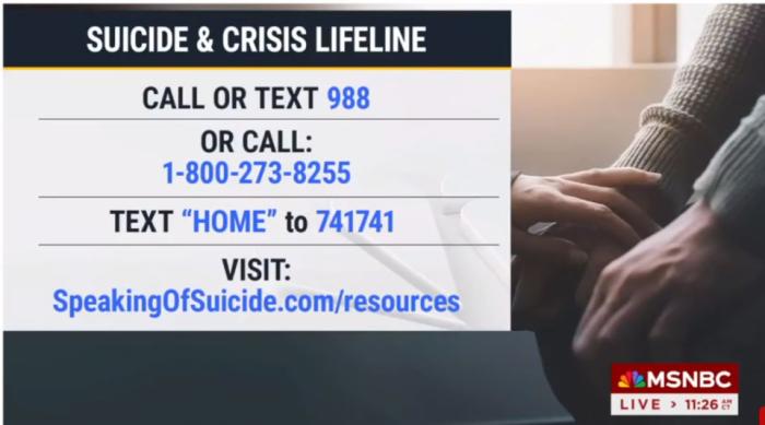 前面還挺正常,就是對(duì)事件的報(bào)道,畫面也在播報(bào)員和現(xiàn)場(chǎng)鏡頭之前互相切(順帶一提MSNBC的說辭也是“抗議哈以戰(zhàn)爭”),然后話鋒突然一轉(zhuǎn):“如果你發(fā)現(xiàn)有人有心理健康風(fēng)險(xiǎn),請(qǐng)及時(shí)撥打預(yù)防自殺熱線XXXXX……”
