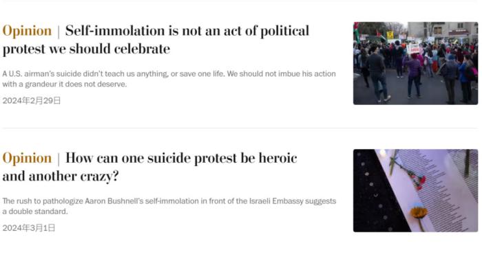 實(shí)際上,因?yàn)椴际矁?nèi)爾在直播中的話有非常多的政治標(biāo)簽,標(biāo)題想要體現(xiàn)自焚事件的原因本來是非常容易的。但在西方主流媒體的報(bào)道標(biāo)題中,最能直觀表明布什內(nèi)爾行為原因的三個(gè)關(guān)鍵詞——“加沙”(Gaza)“種族滅絕”(genocide)乃至“抗議”(protest)字樣均未出現(xiàn)。