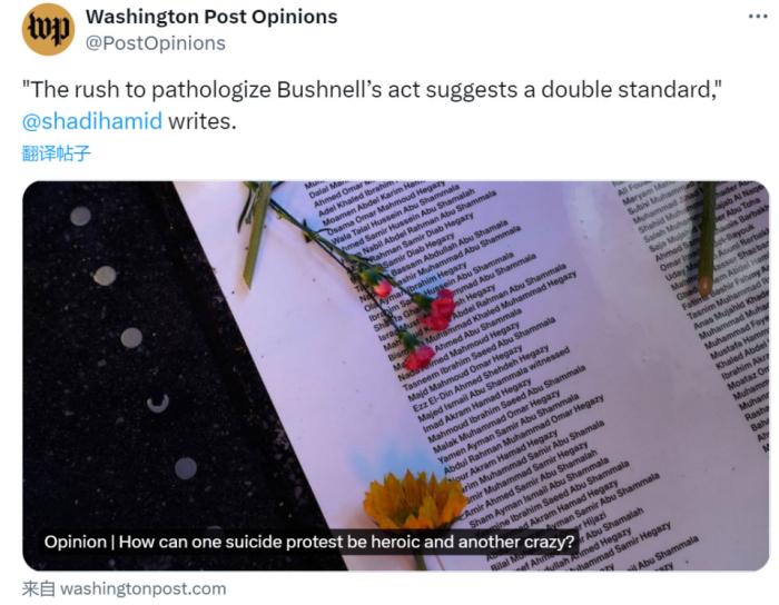 2月25日在以色列駐美大使館門前自焚身亡以抗議美以在加沙進(jìn)行種族滅絕的25歲現(xiàn)役美空軍亞倫·布什內(nèi)爾,以身證道,成了近期震驚世界的事件。關(guān)于這位義士的生平簡介、抗議行動(dòng)本身和以后的價(jià)值、意義,這兩天想必各位也聽了、看了不少了,今天烏鴉來談?wù)勥@次自焚抗議事件發(fā)生后,也許更加值得細(xì)品的一些狀況。