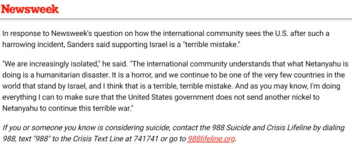 另一家媒體《新聞周刊》,現(xiàn)在則會(huì)在每一篇有關(guān)布什內(nèi)爾的文章文末附上預(yù)防自殺熱線的信息。比如下面這篇文章只是關(guān)于美國左翼議員伯尼·桑德斯對(duì)布什內(nèi)爾事件的評(píng)論,內(nèi)容跟布什內(nèi)爾本人其實(shí)無甚關(guān)系,也要附上這么一段……