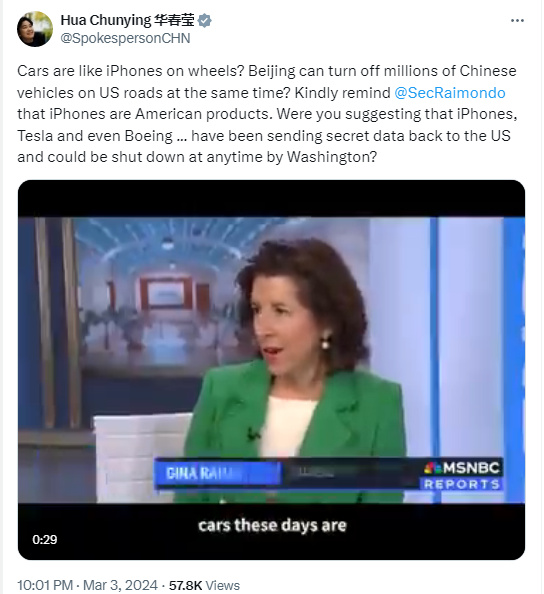 3月3日,華春瑩在社交媒體上發(fā)文回應(yīng)美方這番言論,“汽車(chē)就像是裝了輪子的iPhone(蘋(píng)果手機(jī))?北京能讓美國(guó)道路上的數(shù)百萬(wàn)中國(guó)汽車(chē)同時(shí)熄火?友好提醒一下,iPhone是美國(guó)產(chǎn)品。你是不是在暗示iPhone、特斯拉甚至波音……一直在將機(jī)密數(shù)據(jù)傳送回美國(guó),隨時(shí)可能被華盛頓關(guān)停?”