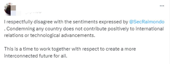 還有網(wǎng)友表示,譴責(zé)任何國(guó)家,不會(huì)對(duì)國(guó)與國(guó)之間的關(guān)系和科技進(jìn)步帶來(lái)積極貢獻(xiàn),“現(xiàn)在是時(shí)候共同努力,為所有人創(chuàng)造一個(gè)更好溝通的未來(lái)?!?/p>
