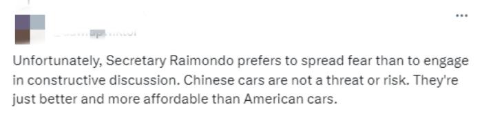 一名外國(guó)網(wǎng)友表示,雷蒙多喜歡“散布恐懼,而非進(jìn)行建設(shè)性的討論”,而“中國(guó)制造的汽車(chē)比美國(guó)汽車(chē)更好、更便宜”。