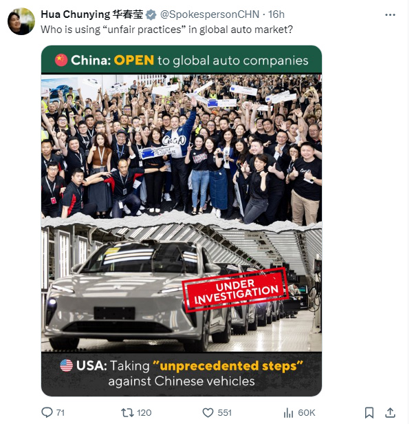華春瑩還發(fā)布了一張圖,標(biāo)明中國(guó)和美國(guó)在汽車(chē)領(lǐng)域的做法并寫(xiě)道,“是誰(shuí)在全球汽車(chē)市場(chǎng)采取‘不公平的做法’?”