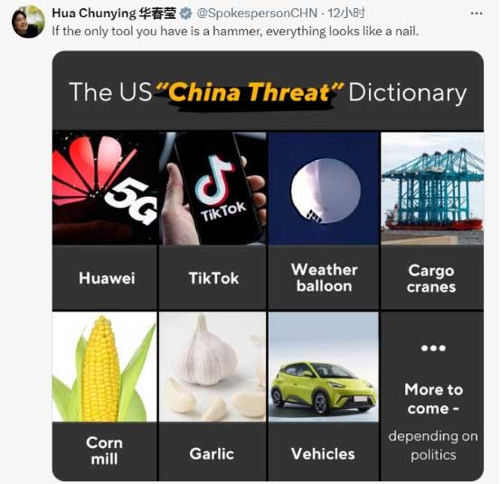 華春瑩最后回?fù)簦叭绻阄ㄒ坏墓ぞ呤清N子,那么所有東西看起來都像釘子?!边@條帖文隨附圖片上,列出美國以往炒作“中國威脅”的詞典:包括華為,TikTok,氣象無人飛艇,起重機(jī),玉米加工廠,大蒜,汽車……還有更多,取決于政治因素?!?/p>