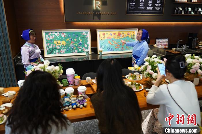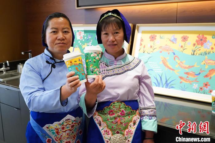 圖為農民畫家展示她們被印在星巴克咖啡紙杯上的畫作。中新網記者 劉冉陽 攝