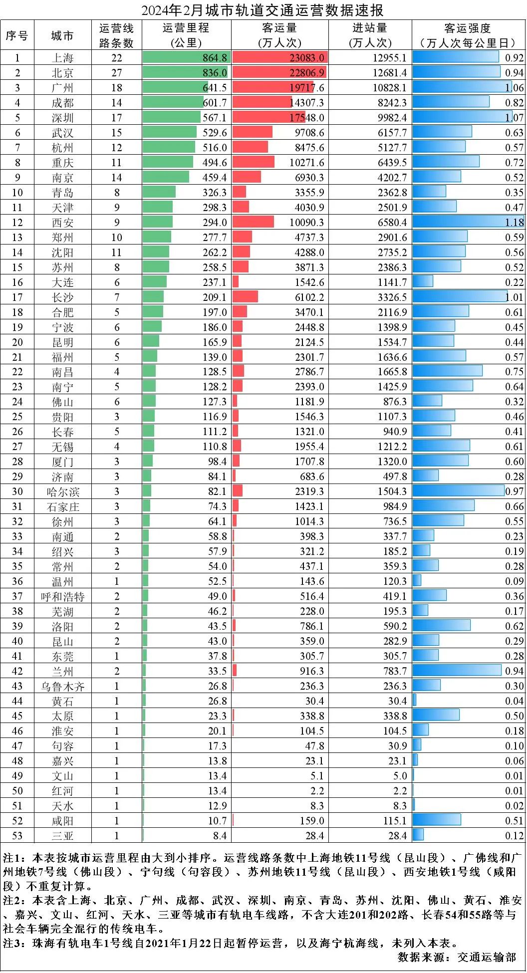 中新網(wǎng)3月12日電 據(jù)交通運輸部微信公眾號消息,2024年2月,31個省(自治區(qū)、直轄市)和新疆生產(chǎn)建設(shè)兵團共有55個城市開通運營城市軌道交通線路308條,運營里程10205.6公里,實際開行列車317萬列次,完成客運量20.5億人次,進站量12.4億人次。2月份,客運量環(huán)比減少6.1億人次,降低22.9%,同比減少1.3億人次,降低6%。2月份全國總運營里程的平均客運強度為0.693萬人次每公里日,環(huán)比降低17.6%,同比降低14.4%。本月無新開通線路。