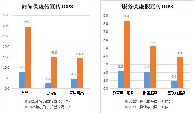 消費者在購物時會接觸到各種各樣的宣傳信息,但海量的宣傳信息并非都是真實可信的,一些商家以夸大其詞、隱瞞真相等手段,誘使消費者做出錯誤的消費選擇。2023年,全國12315平臺接收虛假宣傳投訴舉報144.3萬件,同比增長1.7倍。從商品服務(wù)類別來看,商品類別中虛假宣傳投訴舉報較多的有食品(29.6萬件)、化妝品(15萬件)、家居用品(14.4萬件);服務(wù)類別中虛假宣傳投訴舉報較多的有教育培訓(xùn)服務(wù)(8.4萬件)、銷售服務(wù)(5.2萬件)、互聯(lián)網(wǎng)服務(wù)(3.8萬件)。消費者反映的問題主要集中在商家虛構(gòu)產(chǎn)品效果、夸大產(chǎn)品優(yōu)勢,通過“好評返現(xiàn)”提高虛假聲譽(yù),誤導(dǎo)消費者購買等。