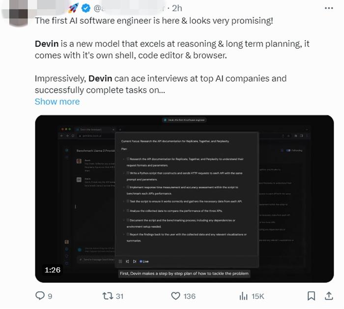 “第一位AI工程師看起來很有希望,令人印象深刻的是,Devin可以在頂級AI公司的面試中脫穎而出,并且成功地完成了任務(wù)。”有人工智能專家在社交平臺分享觀點。多個Devin編程的視頻也在網(wǎng)絡(luò)流傳。