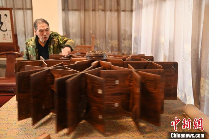 圖為梁寶寶展示畢生心血木雕作品《天地開寶照 日月風水明》。李亞龍 攝
