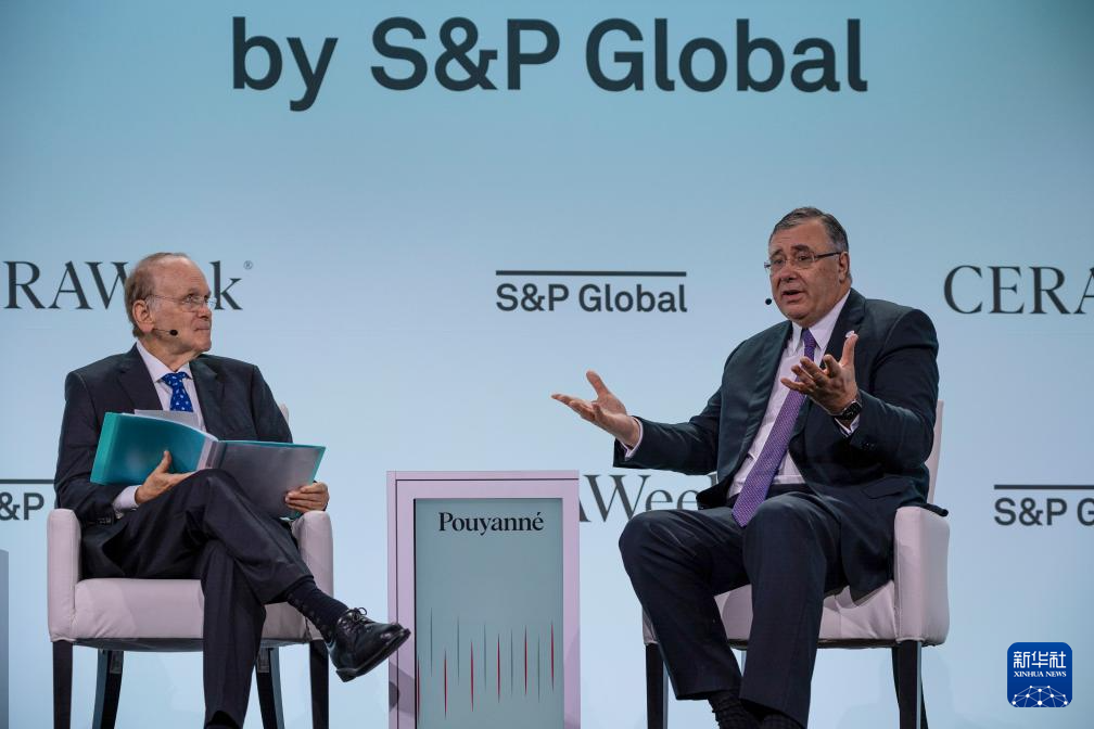 3月18日,法國道達(dá)爾能源首席執(zhí)行官帕特里克·普亞納(右)在美國休斯敦舉行的能源界高端會(huì)議“劍橋能源周”上分享觀點(diǎn)。新華社發(fā)(陳晨攝)