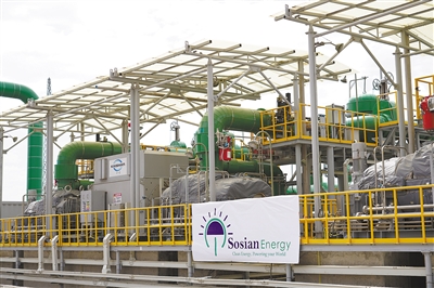 由中國(guó)企業(yè)承建的肯尼亞索西安地?zé)犭娬居谌ツ?月底投產(chǎn)送電,成為非洲首個(gè)從設(shè)計(jì)、產(chǎn)品生產(chǎn)到建設(shè)、調(diào)試完全由中國(guó)企業(yè)獨(dú)立完成的地?zé)岚l(fā)電站。該電站設(shè)計(jì)裝機(jī)容量35兆瓦,每年可減少二氧化碳排放24萬(wàn)噸。圖為索西安地?zé)犭娬?號(hào)發(fā)電機(jī)組。