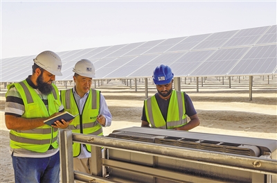由中國(guó)企業(yè)總承包的阿聯(lián)酋艾爾達(dá)芙拉光伏電站可供20萬(wàn)戶居民用電,每年減少二氧化碳排放240萬(wàn)噸,使清潔能源在阿聯(lián)酋總能源結(jié)構(gòu)中的比重提高到13%以上。圖為中外員工在艾爾達(dá)芙拉光伏電站工作。