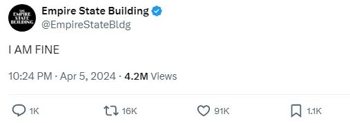 地震發(fā)生幾分鐘后,紐約地標(biāo)建筑帝國大廈的官方社交媒體賬號發(fā)文稱:“我很好”。