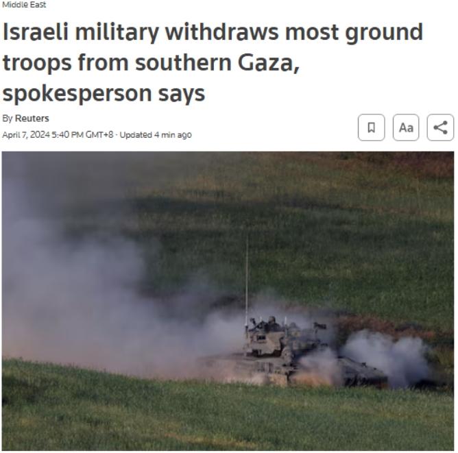 中新網(wǎng)4月7日電 據(jù)路透社消息,當(dāng)?shù)貢r(shí)間4月7日,以色列軍方發(fā)言人表示,以軍已從加沙地帶南部撤出幾乎所有地面部隊(duì),僅留下一個(gè)旅的人員。