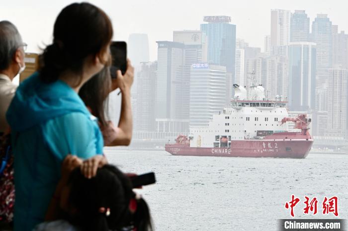 圖為香港市民及游客觀看極地科考破冰船“雪龍2”號在維港上航行。記者 李志華 攝