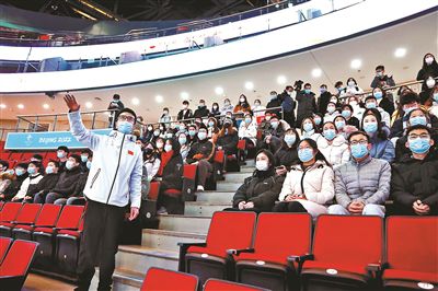 在現(xiàn)場,陳大鵬通過“由內(nèi)及外”“由下至上”的方式,將場館的競賽層、觀眾層、包廂層等流線以及各點(diǎn)位進(jìn)行了詳細(xì)的講解,并以“你需要知道的25件事”為主題,為志愿者們講解了作為場館工作人員必須遵守的各項(xiàng)規(guī)章制度?!斑@25件事包括志愿者在場館工作的方方面面,既有場館日常管理、防疫規(guī)定,又有志愿者工作期間個人生活及行為規(guī)范、工作紀(jì)律和文明禮儀等?!标惔簌i說。