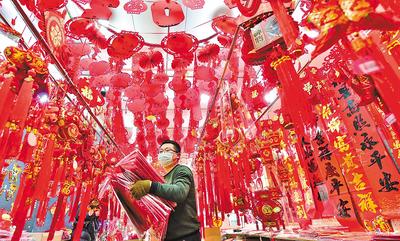 1月8日,石家莊市南三條市場的商戶在忙著準備年貨。隨著農歷新年的臨近,春聯(lián)、福字、燈籠、虎年生肖飾品的銷售行情逐日升溫。 河北日報通訊員 張曉峰攝