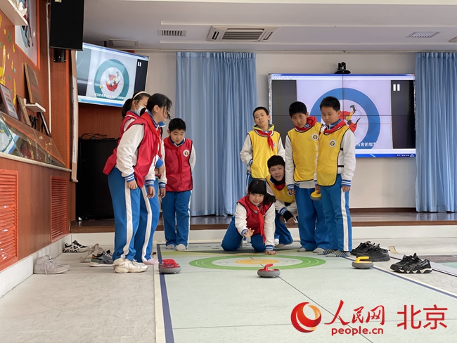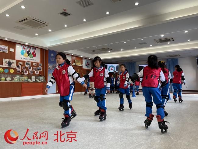 海淀首個小學“冰雪教室”亮相,可進行冰壺、短道速滑等項目。人民網 董兆瑞攝