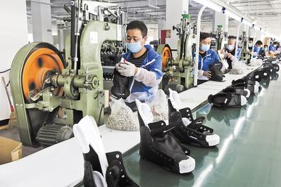在張家口高新區(qū)冰雪運動裝備產(chǎn)業(yè)園,工人在一家冰球鞋生產(chǎn)企業(yè)車間工作。新華社發(fā)